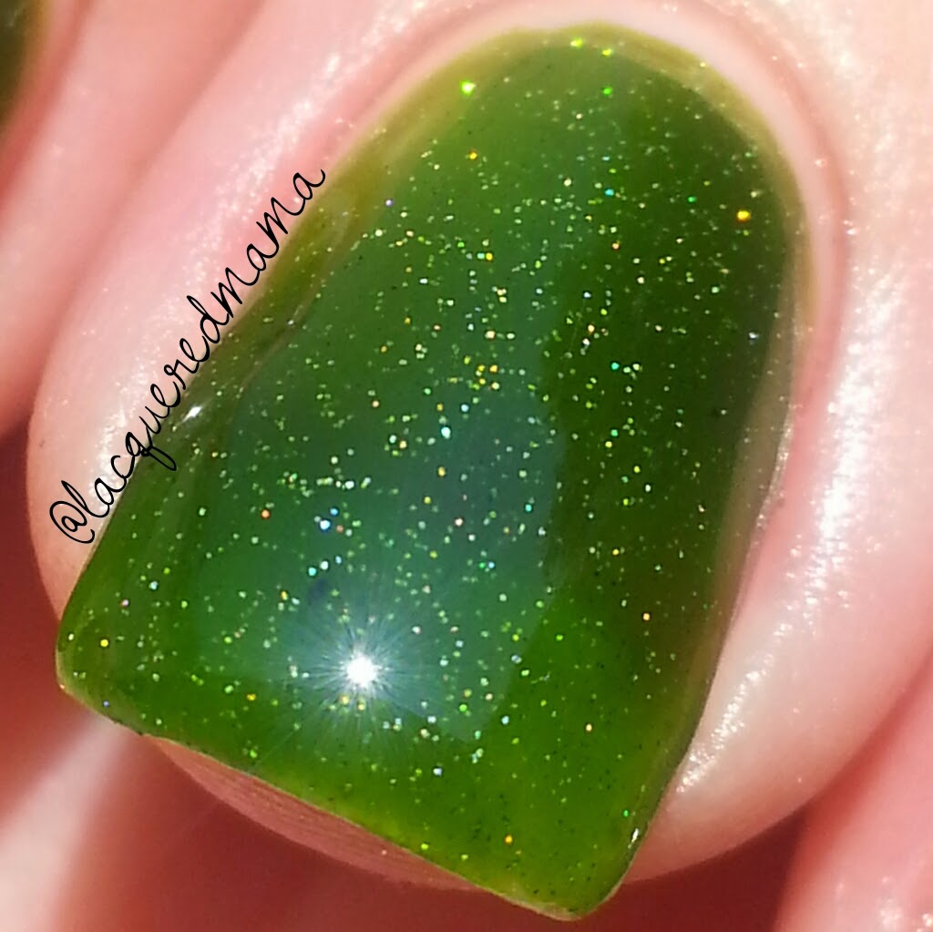 Next I have Ready to Mingle - simply a gah-or-geous green jelly with scattered holo. I love reds, but I really really love greens too! This one is amazing! Another excellent formula and great pigment that again, did not require an undie! I did 3 coats, plus topcoat, but you could totally get away with just 2. I love that this color of green is really pretty for summer, but I can't wait to wear it during the December holidays!